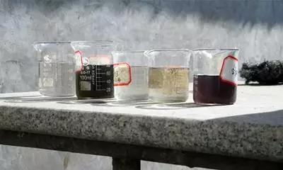 如下圖所示,從右到左一次是調(diào)節(jié)池,水解池,二沉池,氣浮池的水質(zhì)外觀。