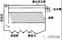 斜板與水平方向的夾角稱為傾斜角,傾斜角a越小,截留速度u0越小,沉降效果越好,但為使污泥能自動(dòng)滑下排泥通暢,a值不能太小,對(duì)上向流斜板、斜管沉淀池,a一般不小于55°-60°。對(duì)下向流斜板、斜管沉淀池因排泥比較容易,一般不小于30°-40°。