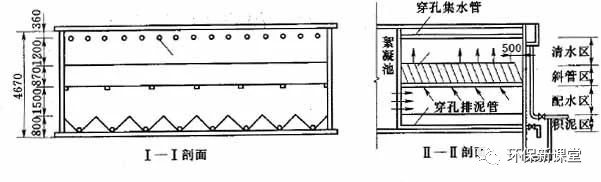 水流從水平方向進(jìn)入沉淀池,進(jìn)水區(qū)主要有穿孔墻,縫隙墻和下向流斜管進(jìn)水等形式,使水流在池寬方向上布水均勻,其要求和設(shè)計(jì)布置與平流式沉淀池相同。為了使上向流斜管均勻出水,需要在斜管以下保持一定的配水區(qū)高度,并使進(jìn)口斷面處的水流速度不大于0.02-0.05m/s。