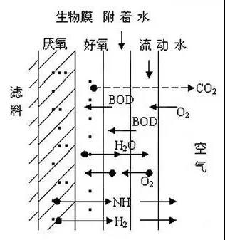 生物膜上的微生物在有溶解氧的條件下對有機物進行分解和機體本身進行新陳代謝,因此產(chǎn)生的二氧化碳等無機物又沿著相反的方向,即從生物膜經(jīng)過附著水層轉(zhuǎn)移到流動的廢水中或空氣中去。這樣一來,出水的有機物含量減少,廢水得到了凈化。