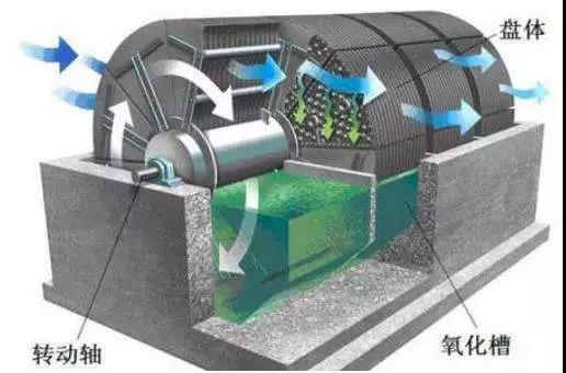 廢水從槽的一端流向另一端。盤軸高出水面,盤面約40%浸在水中,約60%暴露在空氣中。盤軸轉(zhuǎn)動時,盤面交替與廢水和空氣接觸。盤面為微生物生長形成的膜狀物所覆蓋,生物膜交替地與廢水和空氣充分接觸,不斷地取得污染物和氧氣,凈化廢水。膜和盤面之間因轉(zhuǎn)動而產(chǎn)生切應(yīng)力,隨著膜的厚度的增加而增大,到一定程度,膜從盤面脫落,隨水流走。
