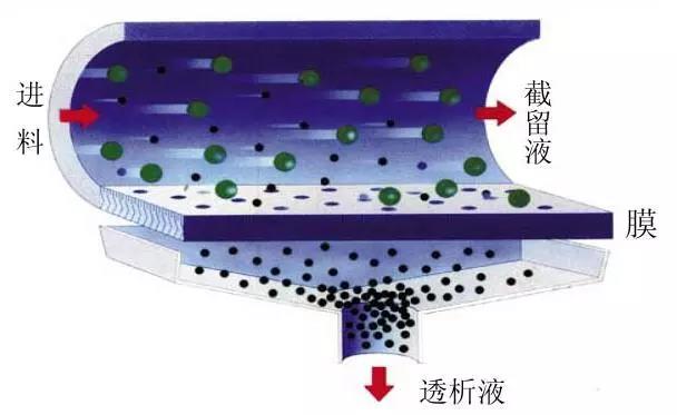 以常見(jiàn)的超濾過(guò)程為例,分離機(jī)理主要為篩分:膜表面有微孔,流體流經(jīng)膜一側(cè)的表面時(shí),部分較小的分子隨部分溶劑穿過(guò)膜到達(dá)另一側(cè),形成透析液,而大分子則被截留在原來(lái)的一側(cè),形成截留液,從而達(dá)到了將大分子溶質(zhì)與小分子溶質(zhì)及溶劑分離開(kāi)的目的。