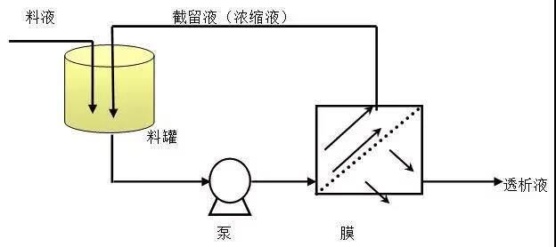 目前常見(jiàn)的膜分離過(guò)程以壓差為驅(qū)動(dòng)力、以錯(cuò)流過(guò)濾方式進(jìn)行,可在常溫下進(jìn)行分子級(jí)的過(guò)濾分離,是一種物理過(guò)程,其間不發(fā)生相變。動(dòng)力由泵提供,流經(jīng)膜表面時(shí),部分較小的分子透過(guò)膜,而大分子被截留。膜系統(tǒng)組成及基本過(guò)濾原理見(jiàn)下圖: