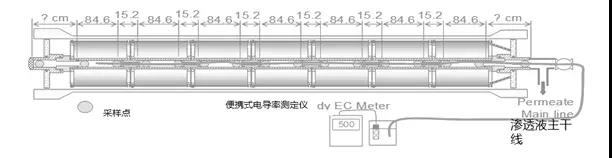 如流量增加而脫鹽率下降,在任何測量值顯著升高的情況下,應(yīng)檢查所有膜殼的產(chǎn)水電導(dǎo)率。針對有明顯問題的任何一根管道,可以采用“中心管測試方法”來識別哪支膜元件。具體測試包括將軟管伸入螺旋卷繞元件的中心管,一直到壓力管的末端,然后慢慢地將其拉出,獲取軟管中的部分滲透液。然后對樣品的電導(dǎo)率進(jìn)行測試。如果某一點(diǎn)的值突然升高,可根據(jù)已經(jīng)拉出的軟管長度來確定泄漏的位置。