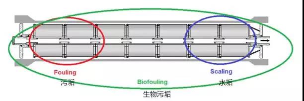 有機(jī)污垢主要導(dǎo)致上游側(cè)管道堵塞,而如果下游側(cè)鹽含量較高,可能導(dǎo)致鹽沉淀,即無機(jī)污垢或水垢。生物污垢可以擴(kuò)散到整個系統(tǒng),因此可存在于各個點(diǎn)。