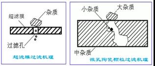 這是過(guò)濾截留原理示意圖,左圖表示超濾由固定孔徑機(jī)械截留,截留的雜質(zhì)在表面堆積,小于孔徑的雜質(zhì)會(huì)透過(guò)膜,液體的過(guò)濾路徑只有0.1微米。