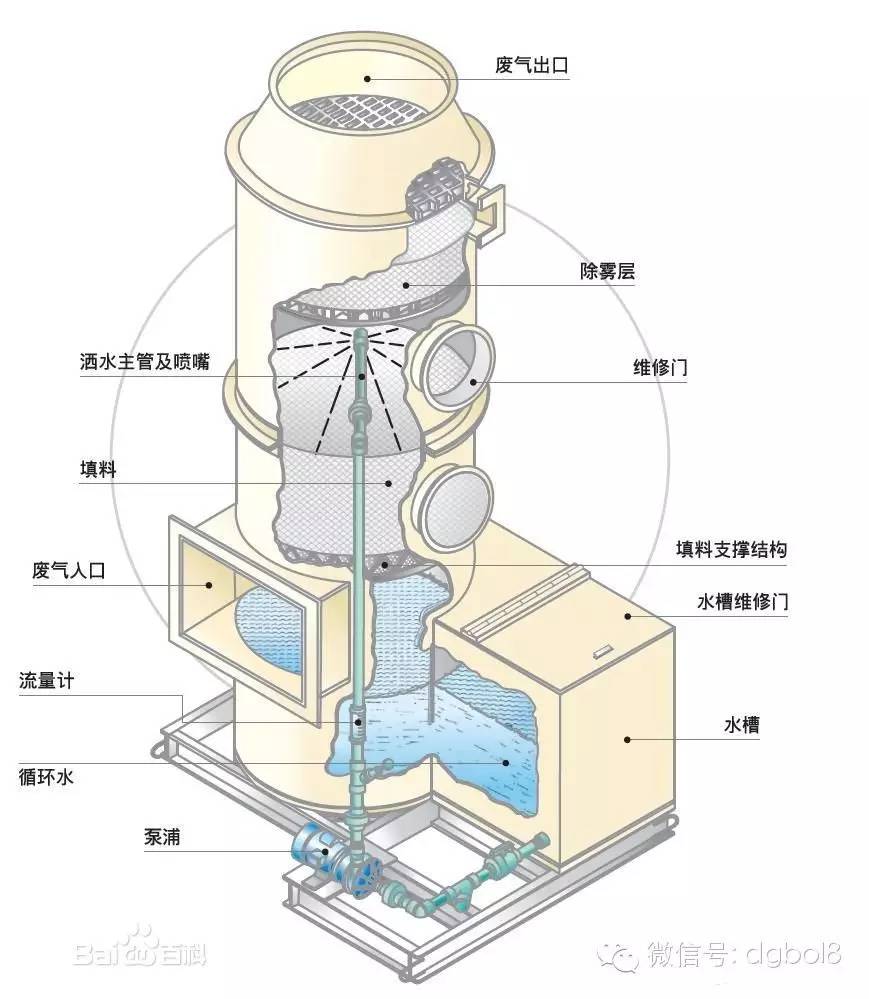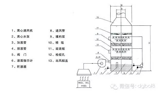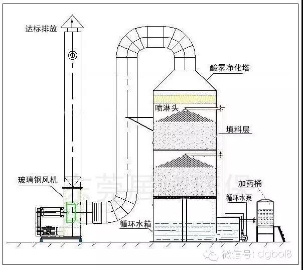 酸霧廢氣由風管引入凈化塔,經(jīng)過填料層,廢氣與氫氧化鈉吸收液進行氣液兩相充分接觸吸收中和反應,酸霧廢氣經(jīng)過凈化后,再經(jīng)除霧板脫水除霧后由風機排入大氣。吸收液在塔底經(jīng)水泵增壓后在塔頂噴淋而下,最后回流至塔底循環(huán)使用。凈化后的酸霧廢氣達到廣東省地方排放標準的排放要求,低于國家排放標準。